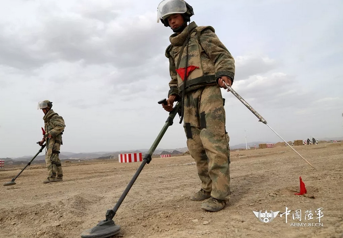 淺灘偵察,接到指令后,裝甲運輸車快速沖擊至淺灘障礙前,工兵班組魚貫而出,排雷手身著20公斤的搜爆服在濁水進行排雷作業,水柱騰空而起,防坦克地雷被成功起爆。沖出險灘后,一片高密度、多型號的雷場封鎖了裝甲車前進的道路,兩名投錨手將半發雷引爆后,探雷手立即手持探雷器,開始了探雷作業,為了使作業環境更加貼近實戰,他們還在雷場中專門增加設置了鐵絲彈殼等金屬干擾物。