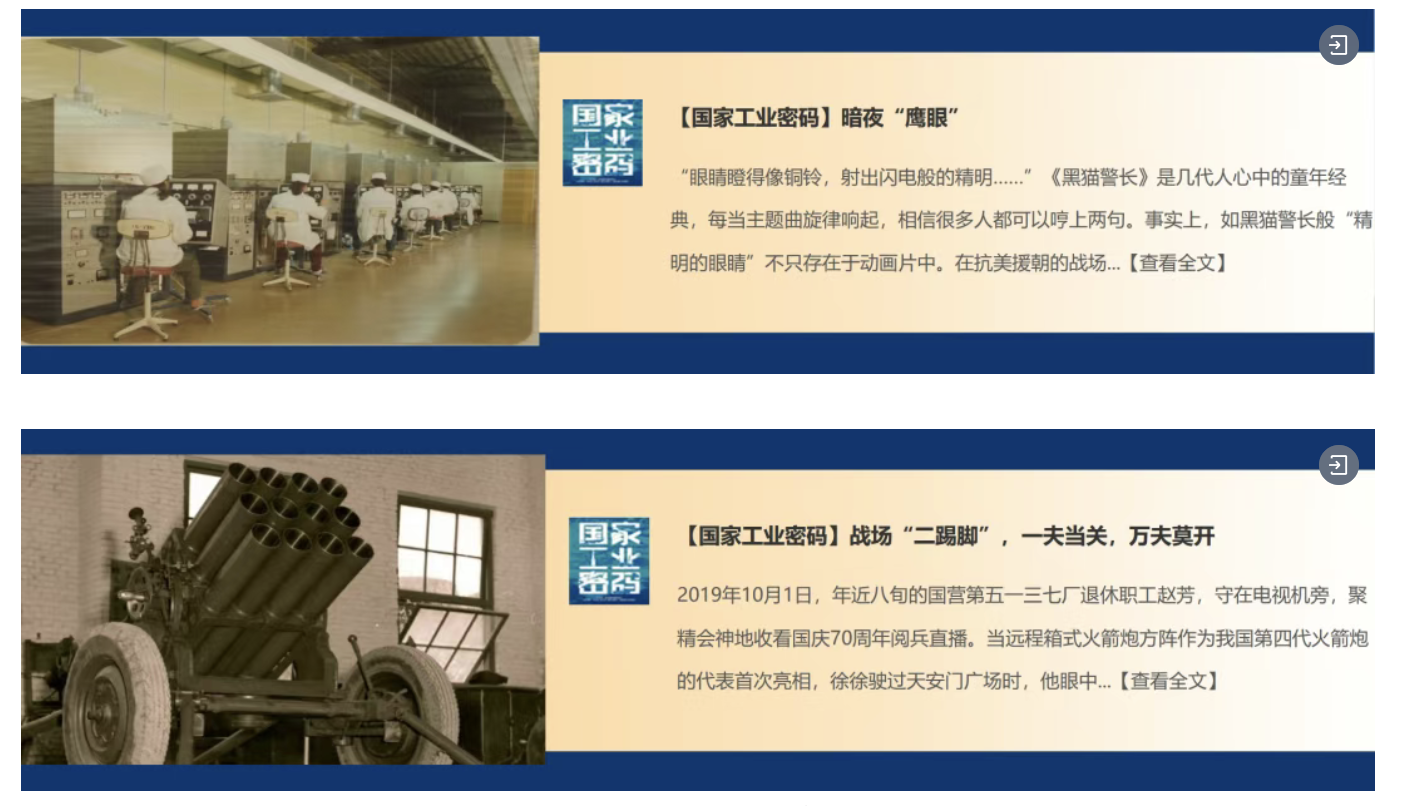 兵器工業集團參與國務院國資委新聞中心聯合新華網、云聽APP、喜馬拉雅APP、機械工業出版社推出的《國家工業密碼》——有聲故事網絡互動傳播活動,刊發《暗夜“鷹眼”》《戰場“二踢腳”,一夫當關,萬夫莫開》。